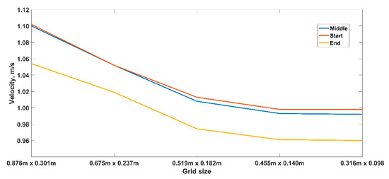 The hydrodynamic modeling considered in this study solved the three-dimensional Reynolds Average Navier-Stokes equations under the hydrostatic and Boussinesq approximations, using the Delft3D-FLOW model [48]. The numerical solution was obtained by the Alternating Direction Implicit scheme and employing the k-ε turbulence closure method [49]. The solution was calculated on an unstructured grid with rectangular dimensional elements characterized by an average longitudinal value of 0.455 m and a transversal value of 0.140 m. These values of the unstructured grid size were selected to ensure independence of the model results via a sensitivity analysis. Grid spacing was reduced until no appreciable changes to the flow field were observed. Figure 3 presents the analyses for the cross-sectional average velocity at the head (start), the middle, and the exit (end) of the first pool.