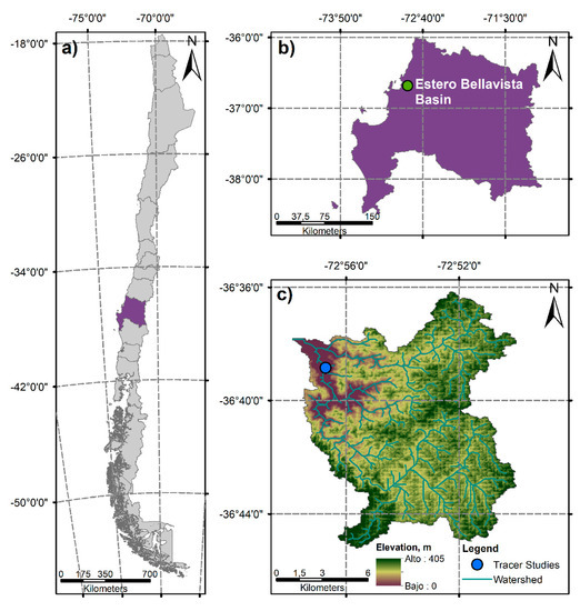 (a) Location of the Biobío region in Chile; (b) the Bellavista watershed location within the Biobío region; and (c) the tracer study location within the Bellavista watershed.