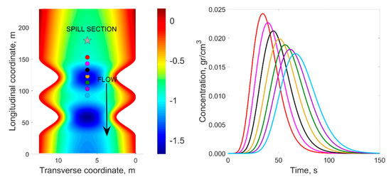 (a) Plan view of the sampling points in the synthetic bathymetry domain for the time concentration curves. Pont spacing was 10 m; and (b) time-concentration curves for bathymetric setting with .