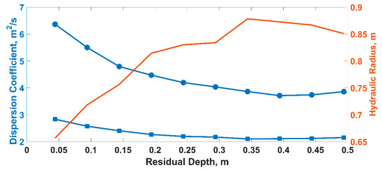 Comparison of the method of Thomann and Mueller [54] and the method of the moments [55] for estimation of the longitudinal dispersion coefficient for the bathymetries described in Table 2. Variation of the dispersion coefficient (blue) and the hydraulic radius in the pool (orange) with respect to the residual pool depth for (a) method of Thomann and Mueller (box); and (b) method of the moments (circles).