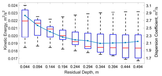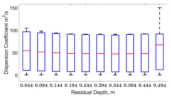 To explore the relation between turbulent fluid motion through complex bathymetry and its impact on the dispersion coefficient, Figure 7 shows the simulated range of variation in turbulent kinetic energy (TKE) for each one of the studied pool-riffle macrostructures. The magnitude of the TKE variation presented a minimum range between the residual pool depths of 0.14 and 0.20 m, with increasing variance in both directions. As the residual pool depth increased, an increased variance in TKE occurred, owing to the sudden fluid acceleration/deceleration, as the flow entered and exited the pool. The median values of TKE showed a decreasing trend with increasing residual pool depth, with a minimum value around 0.4 m. It could be noted that the trend in median TKE values presented the same tendency as the dispersion coefficient, reinforcing the direct relation between the dispersion coefficient and fluid turbulence. These findings support the appropriateness of the three-dimensional numerical modeling results.
