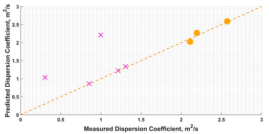 Longitudinal dispersion coefficients. are the coefficients from numerical modeling and field experiments, are the coefficients predicted by Equation (8).
