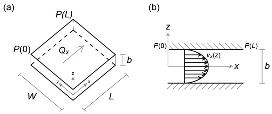 We consider the flow of a non-Newtonian Prandtl–Eyring fluid between two smooth parallel plates separated by a distance b (fracture aperture); the coordinate system is shown in Figure 1, with upper and lower plates at . A uniform pressure gradient is applied in the -direction, where the generalized pressure includes gravity effects, is pressure, is gravity, and is fluid density. Assuming flow in the -direction, the velocity is solely a function of under the hypothesis of infinite width W. Momentum balance yields a linear shear stress profile: