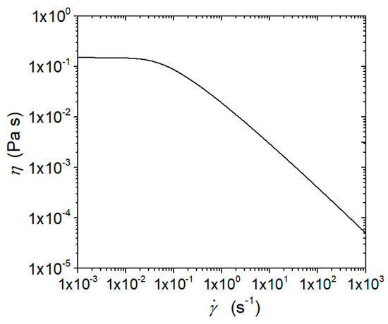 In this section, the parallel arrangement is considered, and a comparison between the power-law and the Prandtl–Eyring models is proposed. Here, we aim to analyze the effects of a shear stress plateau in the Prandtl–Eyring model for low shear rates. The nature of a non-Newtonian fluid is hard to model, and this inevitably leads to a complex expression for the fluid rheology. The most commonly used model for a shear-thinning fluid is the power law relationship; it is a valid tool for studying non-Newtonian fluid behavior without introducing excessive mathematical complexities. It is, however, not entirely realistic, as for low shear rates (, the apparent viscosity tends to infinity (), while for (, it results in . The Prandtl–Eyring model is characterized by a viscosity upper bound; this rheologic model presents a plateau, and for , the fluid resembles a Newtonian fluid with . To compare the two rheologies, a Prandtl–Eyring fluid ( and ) is considered [7] and adopted to evaluate the parameters of a comparable power-law fluid by means of a least-squares fit performed in the range of a shear rate between 10 and 1 × 103 s−1: the result of the best fit yields and (Figure 7).