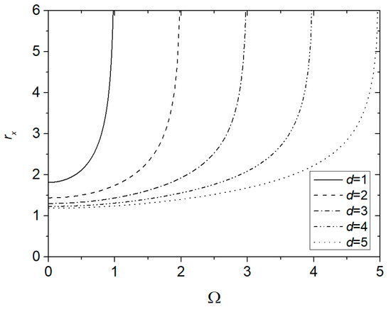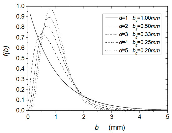 Figure 6 illustrates the ratio of the hydraulic to mean aperture defined by Equations (27) as a function of for different values of . The ratio strongly increases with , more so for lower values of , i.e., a more skewed distribution. The curves show a vertical asymptote when the dimensionless pressure gradient approaches . For low values of , the curves are almost horizontal.