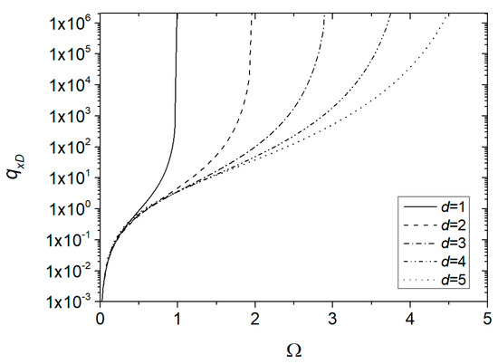 The relationships in Equations (24)–(26) establish that the ratio between the shear stress at the wall of a parallel-plate fracture of aperture and the characteristic shear stress describing the Prandtl–Eyring fluid cannot exceed the shape parameter of the aperture distribution. Figure 5 shows the dimensionless flow rate per unit width as a function of for different values of . It is seen that as , the flow rate tends to ; such negative values are obviously not realistic. On the other hand, for , the flow rate tends to infinity, and the curves show a vertical asymptote of the equation . Similarly, such results are unrealistic. For low values of , the curves tend to overlap, regardless of the value of . In general, the flow rate depends, in a nonlinear fashion, on the dimensionless pressure gradient and the distribution parameters.