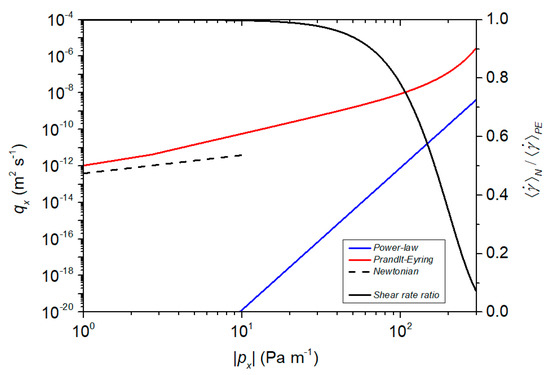 Plot of flow rate vs. pressure gradient; the red solid line represents the Prandtl–Eyring model ( and ), the blue solid line represents the power-law model ( and ), and the black dashed line represents the Newtonian model (). The plot of shear rate ratio vs. pressure gradient is illustrated by the black solid line.