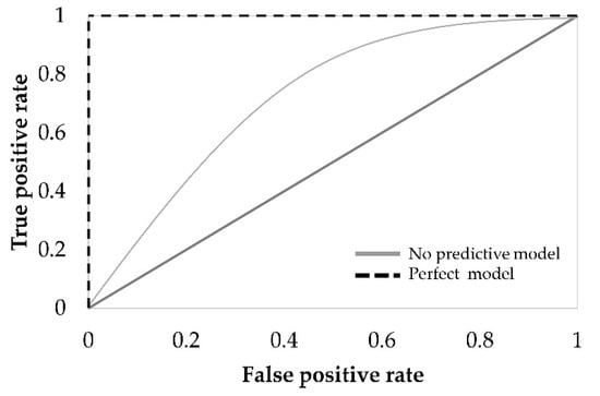 The ROC curve is a helpful technique for visualizing and selecting the most suitable model based on performance [47]. This curve is obtained by plotting the TPR as a function of the FPR (Figure 1), considering different probability thresholds to make class predictions [39]. The ROC curve is considered reliable when the curve is over the 45° line. Perfect classification is graphically defined by the union of two lines, corresponding to FPR equal to 1 and TPR equal to 1 [9].