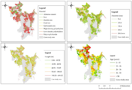 The proposed models were applied to a WDN in Bogotá (Colombia), presented in Figure 2. The WDN has 61,251 pipes with an overall network length of 1819 km and 28,671 house connections. The network has different pipe materials, distributed as follows: polyvinyl chloride (70.6%), asbestos-cement (24.2%), high-density polyethylene (2.7%), cast iron (0.9%), and others (1.6%). The average pipe is 29 years old, including the 11,442 pipes that have been in operation for over 40 years. The oldest pipes on the network are asbestos-cement (see Figure 2), and the majority of the pipes installed within the past 10 years are made of polyvinyl chloride (PVC). Pipe diameters range from 50.8 to 609.6 mm and approximately 51% of the pipes have a diameter ranging between 50.8 and 76.2 mm.