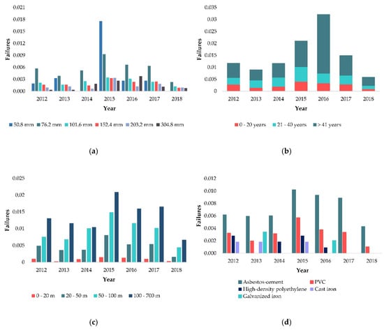 In addition, Figure 3d shows the number of failures per material normalized by the total number of pipes of each material. Failure records revealed that 67.8% of the failed pipes are made of asbestos-cement and 28.3% of PVC. The failure rate of pipe materials is determined by the material’s flexibility, method of manufacture, and manufacturing processes [50]. It was expected that PVC pipes have a lower failure rate than asbestos-cement pipes because plastic materials were the last to be introduced, and their quality has improved significantly over the years. The higher number of failures exhibited by asbestos-cement and PVC pipes also depends on the material distribution, which is described above. Based on these findings, only asbestos-cement and PVC pipes are considered for the analysis. As each type of material has a specific deterioration pattern [9,52], independent (per material) analyses were carried out for each.