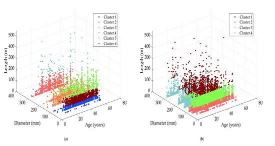 Regarding the statistical models, the K-means clustering approach was applied to separate the data into a number of specified clusters based on pipe diameter, length, and age. Other variables were excluded as using the pipes’ attributes helps to obtain models with greater statistical significance [5,53]. To determinate the optimal number of clusters, the Davies–Bouldin criterion was applied. Thus, the data were divided into six groups for asbestos-cement pipes and four groups for PVC pipes. The DBI calculated for the clustering was 0.6478 and 0.6322 for asbestos-cement and PVC pipes, respectively. The K-means algorithm was run using different initializations of centroids, and the partition that produced the lower sum of squared distance was chosen. Optimal partitions results and the distribution of the data set for the number of clusters calculated are shown in Figure 4. The diameter was the variable that most influenced the partition, followed by the length. The data points of each cluster have a high similarity to each other in terms of diameter and length. As shown in Figure 4, the clusters are composed of pipes with different ages, which could mean that age is not being a good indicator of the pipe condition.