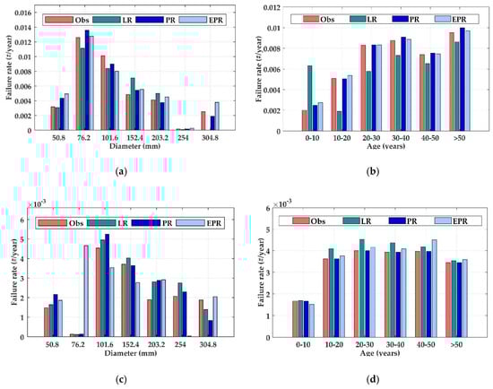 It is important to clarify that the failure rate does not consider the burst history of the individual pipe but the group of pipes. The accuracy of the individual failure rate predictions based on different pipe characteristics is compared in Figure 5. For the asbestos-cement pipes, Linear Regression underestimated the failure rate in most cases. The limitation of this model is more evident in younger pipes and pipes with larger diameters (see Figure 5a,b). Additionally, Poisson Regression and EPR showed adequate precision when calculating the failure rate in different age ranges and pipe diameters. Regarding the PVC pipes, the predicted capability of EPR is limited for the small pipe diameters (i.e., 76.2 mm), as shown in Figure 5c. This prediction has substantially improved for Poisson and Linear Regression. All the models show reasonable accuracy when calculating the failure rate in the different age ranges (see Figure 5d). Based on the results, the Poisson Regression is better than the two other models, while the quality of the Linear Regression and EPR are similar.