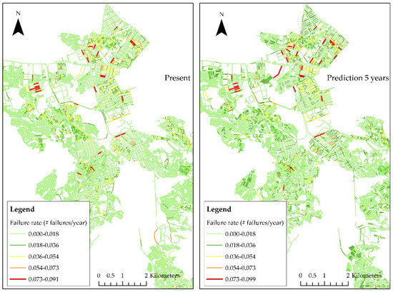Based on the results, the best performance models were used to represent pipe failure rates in the WDN and classify them in different ranges to identify more vulnerable regions. Figure 6 shows the spatial distribution of the failure rates. The results showed that 4% and 5% of the pipes have a high failure rate in the current and predicted condition, respectively. The water utility service must pay attention to those pipes and take an appropriate preventive approach (e.g., maintenance or replacement after inspection). Further, for both current and predicted conditions, most of the pipes exhibit low failure rates. The approach presented above is useful for pipe failure prediction when information about other variables different from pipe attributes (e.g., environmental and operational variables such as water pressure and temperature) is not available. It is recommended to determine an appropriate group size according to the data characteristics to ensure that the aggregation process has statistical significance.