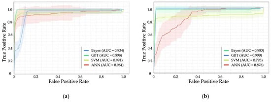 Figure 7 shows the ROC curves for the trained models. The caption provides information about the area under the curve (AUC), which is a quantity that falls in the range between zero and one that integrates over the respective ROC function [9]. Thus, if a comparison is made between models, the most effective model is the one with the largest AUC. For asbestos-cement pipes, the ROC curves for the four selected models are relatively close. GBT achieves the highest AUC (0.998), which indicates that this method is well suited for pipe failure prediction, and ANNs exhibit the lowest AUC (0.984). Concerning PVC pipes, ROC curves for GBT and Bayes are notably close, with the most reliable prediction model being GBT (see Figure 7). The results showed that these models discriminate better between failing pipes and nonfailing ones because its curve is always above the 45° line. Additionally, GBT exhibited the highest AUC and ANNs, the lowest.