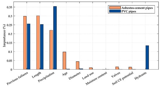 Figure 8 shows the importance of the variables for the GBT model, where high values indicate high relevance for the prediction process. The most important variables were the number of previous failures, length, and precipitation. Some authors found that the number of previous failures was a significant variable for predicting future failure rates and demonstrated their impact on the occurrence of new pipe failures [37,47,57]. Oliveira et al. [58] concluded that inadequate repairs of breaks might produce new failures close to the previous ones. Besides, Debón et al. [47] and Winkler et al. [9] also observed that pipe attributes, such as age, length, and diameter, are significant variables for failure prediction. The other environmental and operational selected variables were not particularly significant in the modeling process (see Figure 8). It is necessary to consider that because of the procedure’s data dependency, the importance of the variables is representative of this case study and not for the pipe failure process.