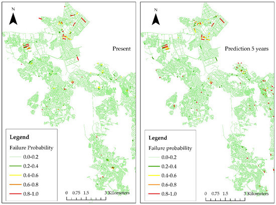 Based on the results, the final GBT models trained are used to predict the failure probability of individual pipes in the WDN. This prediction focuses on a specific pipe and its characteristics, which enables an understanding of a single pipe failure pattern. Figure 9 shows the pipes’ deterioration pattern in the WDN. The results revealed that around 0.17% of the pipes have a high probability of failure in the present condition. For those pipes, it is necessary to use the appropriate maintenance or replacement strategies to avoid failure. Likewise, for both current and predicted conditions, most of the pipes exhibit low failure probability. The analysis of the probability values made it possible to establish that, when comparing the current condition with the predicted condition, there was a 28% increase in the number of pipes with failure probabilities of between 0.6 and 0.8, and an 18% increase in the pipes with failure probabilities of between 0.8 and 1.0.
