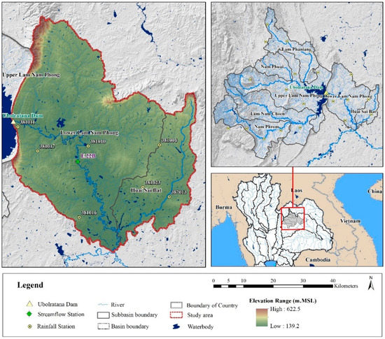 The study focused on the lower Nam Phong River Basin, which is located in the Northeastern region of Thailand, with a total area of approximately 2386 km2, whereas the topography is undulating, varying in elevation from 139 m to 623 m above mean sea level (m+MSL) (note: since the Huai Sai Bat River is a main tributary of the Nam Phong River, the Huai Sai Bat sub-basin is then considered and included in this study, resulting in a larger study area of approximately 3127 km2). The Nam Phong River is considered to be the main river in the Nam Phong River Basin with a length of about 136 km that extends from the Ubol Ratana Dam (receiving the water from Lam Phaniang, Nam Phuai, Upper Lam Nam Phong, Lam Nam Choen, and Nam Phrom sub-basins with the storage capacity of 2431 million m3 (MCM)) at the upstream end to the Chi River at the downstream end (Figure 1). The climate in the river basin is typically dominated by monsoon winds, i.e., the Northeast monsoon brings cool and dry weather during November to February. A dry season prevails from March to May. After this, the wet season is characterized by the Southwest monsoon that lasts from June to October. The average annual temperature is 26.8 °C, ranging from about 16.7 °C in December to about 36.4 °C in April. The average relative humidity, for the year as a whole, is about 71.1%, in which the month with the highest relative humidity is September (82.5%) and the lowest is March (60%). The mean annual rainfall is approximately 1237.6 mm/year, whilst the month with most rainfall is September (224.9 mm) and the least is in January (2.1 mm) [18]. The mean annual discharge is about 1594.9 MCM/year with a minimum discharge of 34.5 MCM/year (in February) and a maximum discharge of 366.0 MCM/year (in October) [19].