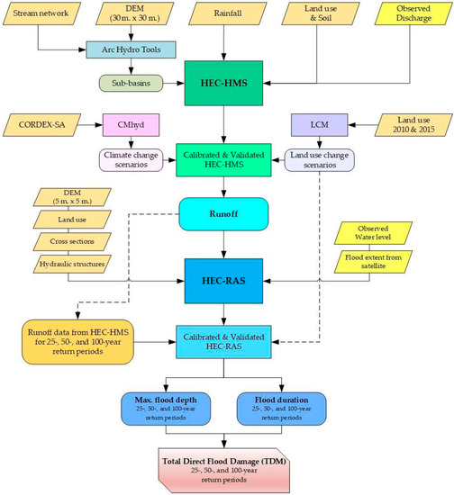 Regarding the climate change issue, the research in [9] was carried out to assess the flood hazard potential under climate change scenarios in the Yang River Basin, Northeast Thailand. Through the applications of hydrological model TOPMODEL and Hydrologic Engineering Center’s River Analysis System (HEC-RAS) hydraulic model, the simulations of floods under future climate scenarios for the periods 2010–2039 (2020s), 2040–2069 (2050s), and 2070–2099 (2080s), were performed. It was found that, in the future, the Yang River Basin will get warmer and wetter, whereas both the minimum and maximum temperature is also projected to increase. Likewise, the average annual rainfall is also projected to be higher in the near future and lower in the far future. In addition, the expected intensity of annual floods is found to be increased for both Representative Concentration Pathway (RCP) 4.5 and 8.5 scenarios, in which the generated flood inundation map under 100-year return period is found to be larger than the baseline flood inundation map (1980–2009) by approximately 60 km2. The impact of climate change on flood events in the Nippersink Creek watershed located in Northeastern Illinois was also assessed by [10], in which the Hydrologic Engineering Center’s Hydrologic Modeling System (HEC-HMS) was applied to model the hydrologic processes based on meteorological inputs from the CMIP5 general circulation models. It was found that the increase in greenhouse gas concentration (under RCP 8.5 scenario) can increase the future precipitation, as well as induce a greater impact on flood events (by the 110% increase from the historically-observed 100-year flood). The study performed by [11] examined the impact of climate change on the hydrological behavior of the Jhelum River basin, in which the bias-corrected CMIP5 data from four GCMs (BCC-CSM1.1, INMCM4, IPSL-CM5A-LR, and CMCCCMS) and two emissions scenarios (RCP 4.5 and RCP 8.5) were used to drive the calibrated the Hydrological Modeling System (HEC-HMS) and the Snowmelt Runoff Model (SRM) for the simulation of projected streamflow. The results revealed that the precipitation (increasing by 183.2 mm or 12.74%) during the monsoon for RCP 4.5 and the rise in temperature (increase in Tmin and Tmax will be 4.77 °C and 4.42 °C, respectively) during the pre-monsoon period for RCP 8.5 during the 2090s will lead to an increase in snowmelt-runoff of up to 48%, evapotranspiration and soil water storage of up to 45%, streamflow by 330 m3/s (22.6%) (calculated by HEC-HMS) and 449 m3/s (30.7%) (estimated by SRM).