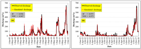 Figure 5. Comparison of HEC-HMS simulated and observed daily discharges during: (a) calibration period; and (b) validation period, at the E.22B gauging station.
