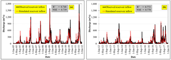 Figure 6. Comparison of HEC-HMS simulated and observed daily Ubol Ratana reservoir inflow during: (a) calibration period; and (b) validation period, at the inlet of the Ubol Ratana reservoir.
