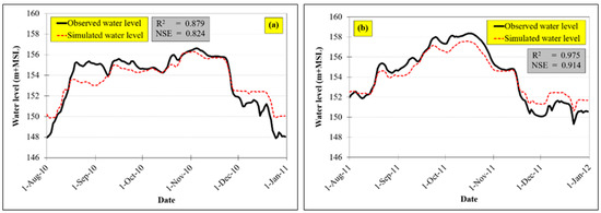 Figure 7. The compared daily water levels of the observation and simulation at the E.22B gauging station during: (a) calibration period (August to December 2010); and (b) validation period (August to December 2011).