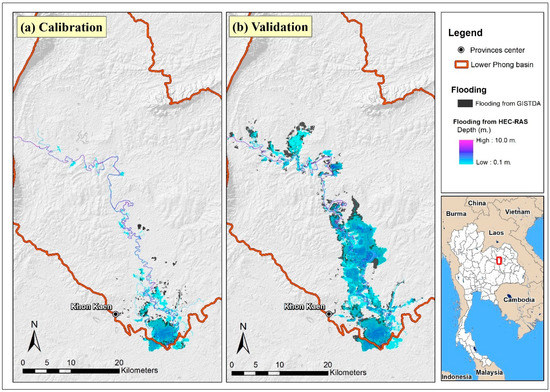 The map of flood extent was delineated by the post-processing of simulated results of the HEC-RAS. The Manning’s n values were varied during this calibration process in order to match the simulated flood extents with satellite observed ones. Eventually, a comparison of simulated and observed maximum flood extents from GISTDA for the October 2010 flood event was created, as illustrated in Figure 8a.