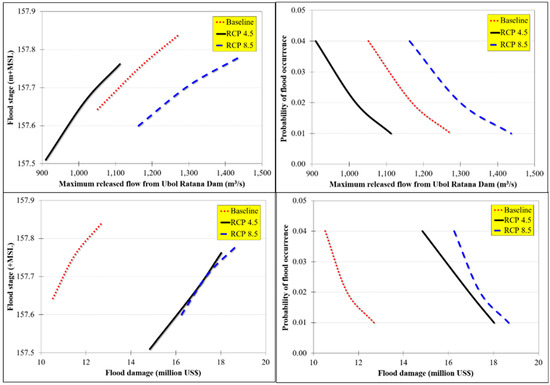 It can be noted that in Table 11, the direct flood damages significantly increase with higher return periods for both the baseline and future conditions. Damages of 10.52, 11.50, and 12.69 million US$ are found for 25-, 50-, and 100-year return periods, respectively, under the baseline scenario. Regarding the future period, the damages are found to be 14.84, 16.91, and 18.02 million US$ for return periods of 25-, 50-, and 100-year, respectively, under the RCP 4.5 scenario, which is less than the damages under RCP 8.5, i.e., 16.24, 17.40, and 18.67 million US$, respectively. Other than that, when considering each type of land use, the agriculture is found to be the most devastated by floods during the baseline period by approximately 48% of the total direct flood damage, following by infrastructure (about 40%), residential area (almost 7%), and the rest. Under two emission scenarios (RCPs 4.5 and 8.5), the majority of direct flood damage is still found to be agricultural with somewhat of a decrease from the baseline by roughly 18%, due to the conversion from agricultural to residential (highest increase from the baseline by nearly 17%), commercial, and industrial development. The results can also be shown in the forms of the relationship among four different variables, i.e., 1) flood stage at E.22B gauging station, 2) maximum released flow from Ubol Ratana Dam, 3) probability or likelihood of flood occurrence (inverse of the return period), and 4) total direct flood damage. For ease of viewing, the relationship is presented by different time horizons and emission scenarios as can be seen in Figure 9. The logic of this figure moves counterclockwise starting from the upper right corner and ending in the lower right corner. Firstly, the northeast quadrant describes the probability or likelihood of flood occurrence equal to or greater than the maximum released flow from the Ubol Ratana Dam occurring within a given time period. Next, the relationship between flood stage at E.22B gauging station and maximum released flow from Ubol Ratana Dam is presented in the northwest quadrant, which describes how high the flood stage at E.22B gauging station might be for a given maximum released flow from the Ubol Ratana Dam. After this, the amount of flood damage that might occur in the lower Nam Phong River Basin, in relation to a certain flood stage at the E.22B gauging station is shown in the southwest quadrant. Eventually, the southeast quadrant relates the expected flood damage that might occur in the lower Nam Phong River Basin to the probability of flood occurrence.