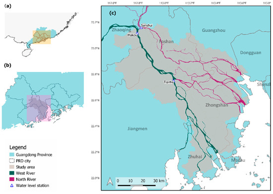 Location of the study area. (a) Southern part of China, (b) Guangdong province and Pearl River Delta (PRD) cities, and (c) study area (shaded in grey) as located primarily in the Foshan-Zhongshan region around the West and North Rivers. The rivers enter into the study area via the Makou and Sanshui gage stations.