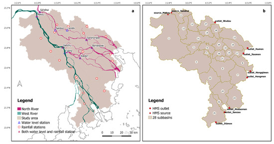 The river network developed has two source inflows at Makou and Sanshui on the West and North Rivers respectively (Figure 2a), and 8 outlets (Figure 2b). A total of 31 reach components are included, of which 12 are from the North River and 19 are from the West River. The Muskingum-Cunge Routing method is used to simulate the propagation or attenuation of river flow within the individual reach segment. As the two main rivers at the upstream of the study area branch into several tributaries downstream, the split ratios become one of the key factors for model calibration. The split ratios for 2 of 11 diversions in the HEC-HMS model are based on the reported ratios at Ganzhu and Zidong stations [26], while the rest are determined by width ratios between the diverted reaches. River cross-sections are assumed to be trapezoidal as commonly used in lieu of detailed information on river geometry. An average Manning’s n of 0.023 is generally recommended and is used here, this is based on a literature review for the PRD region [27,28,29] with reported values ranging over 0.014–0.03. The average slopes of the West and North Rivers are 0.045% and 0.0053% [30] respectively, and these are used as slopes for reaches in the model.