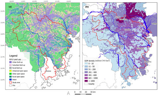 (a) Land categories inside the study area based on the 2014 dataset from the New York University (NYU) Urban Expansion Atlas, and (b) spatial distribution of GDP density in the study area.