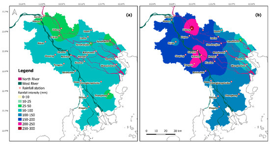 The maximum daily isohyet map based on the 25 rainfall gage station data occurred during the two historical events: (a) 3 July 2017, and (b) 8 June 2018. The isohyets were calculated based on the Inverse Distance Weight method.
