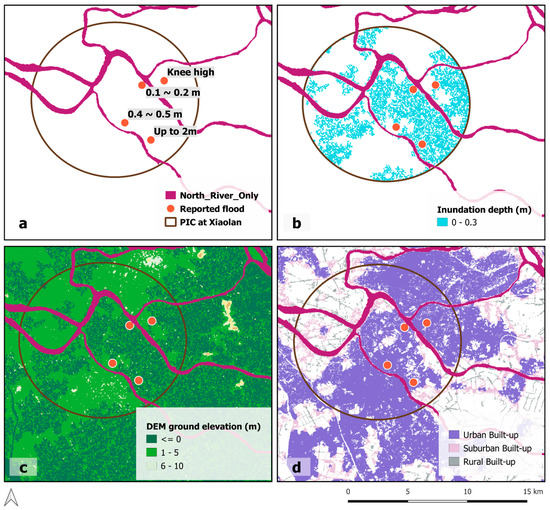 Although none of the six gage stations were reported to have exceeded their warning levels during both events, some were very close to the warning level (e.g., at Sanduo and Lanshi), and for which inundation was reported. The reported inundation areas were mainly surrounding the Xiaolan station and the nearby waterways (Figure 8a), thus this area was selected for inundation estimation. For this, the warning level used is lowered slightly from 3.8 to 3.4 m, so that there was a 19-h window when the water level exceeded 3.4 m. Based on this, the total inundation area is determined to be 47,303 m2 with a flood depth of 0.3 m within a PIC of 7 km radius. This is generally consistent with observation, as summarized in Figure 8, for the reported flooding locations, PIC flood depth and inundated area, DEM ground level elevation as well as the urbanized built-up area. The total estimated urban area in the PIC is 81 km2, which accounts for 53% of the area (Figure 8d).