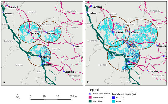 The estimated inundation extent and flood depth under (a) Syn A and (b) Syn B at Sanduo, Lanshi and Ganzhu areas.