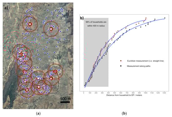 (a) DPs in Community A with 400 m radius (red) and all household locations (blue); (b) Distribution of distances between households and DPs for sampled user households.