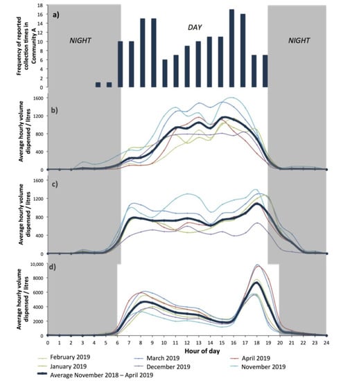 Answers on time of use from the first interview group were recorded and plotted as a cumulative frequency distribution in Figure 2a. This suggests two collection peaks in the morning and afternoon. Average hourly combined usage data (litres) from all 13 DPs over November 2018–April 2019 are plotted alongside this frequency distribution for comparison on the same axis (Figure 2b). This timespan corresponds to the fieldwork while reducing seasonal effects and is disaggregated monthly.