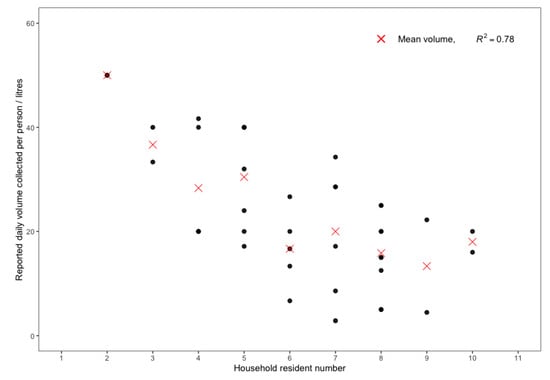 Average volume collected per day per person from DP against number of residents per household (not including n = 12 unquantifiable volumes and one outlier of 80 lpd for the teacher’s collection).