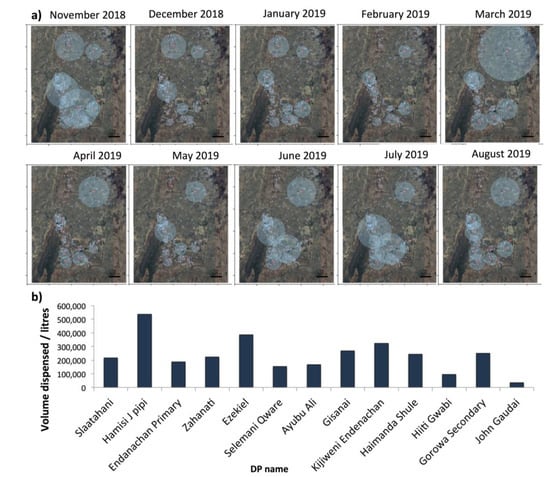 Smart meters allow location of DP and volume dispensed to be further examined using data from the individual DPs, along with household location. The variable volume dispensed from each DP over November 2018–August 2019 is visualised in a moving image (Figure 4). Monthly aggregations are used as they are not disrupted by brief non-functionality events. These dynamic maps give geospatial context to DP location [50,63,64].