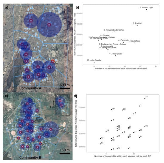 (a) DPs (red) and location of all households in Community A (blue dots) with total volumes dispensed over November 2018–August 2019 as radius of disc (blue) showing Voronoi cells for each DP. (b) Number of households in Community A that are nearest to each DP against total volume dispensed over November 2018–August 2019. (c,d). Community B, as above.