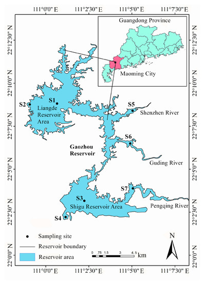 The water samples were collected at seven sites in the Gaozhou Reservoir (Figure 1) in January, April, July, and November of 2015, 2016 and 2017 (12 sampling events with 84 samples in total). Sites S1 and S2 were located in the Liangde reservoir district; sites S3 and S4 were located in the Shigu reservoir district; and, sites S5, S6, and S7 were located at the entrances of the Shenzhen River, the Guding River, and the Pengqing River, respectively.