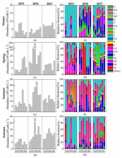 Composition and abundance of the representative functional groups of phytoplankton in Gaozhou Reservoir from 2015 to 2017. (a) abundance in winter; (b) relative biomass in winter; (c) abundance in spring; (d) relative biomass in spring; (e) abundance in summer; (f) relative biomass in summer; (g) abundance in autumn; and (h) relative biomass in autumn.