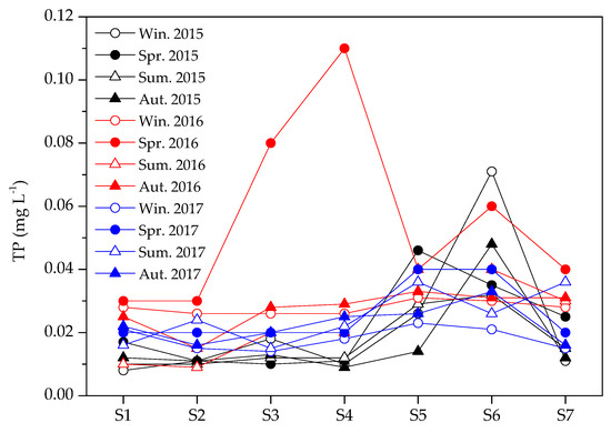 Among all of the environmental factors, measured during the survey period, TP was most strongly affected by season. The average TP in spring of 2016 was 0.056 mg L−1. TP values at S3 and S4 were higher (0.080 mg L−1 and 0.110 mg L−1) than those at other sites, and these values were 4–5 times greater than those in spring 2015 and 2017 (Figure 3).