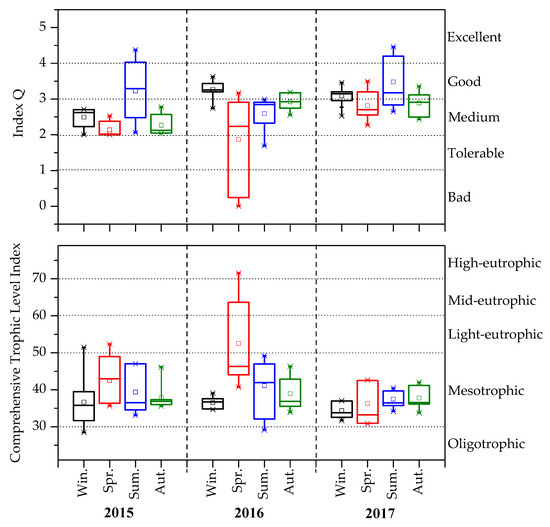 The average Q index across all of samples from 2015 to 2017 was 1.87–3.48 (Figure 4), indicating that the water quality of the reservoir was primarily good and medium. However, water quality in spring of 2016 was obviously bad. The average TLI (Σ) index for all samples from 2015 to 2017 was 34.4–52.6 (Figure 4), implying that water quality was lightly eutrophic. The average TLI (Σ) index was substantially lower in the samples that were collected in the spring of 2016, as compared to those collected in other seasons.