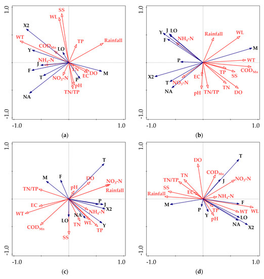 WT, nitrogen, and phosphorus were the most important environmental factors affecting the phytoplankton functional groups (Figure 5). However, the influencing factors were different in different seasons. In the winter, WT and CODMn were positively associated with groups X2 and Y, but they were negatively associated with group M (Figure 5a). In the spring, WT was the main environmental factor affecting group M (Figure 5b). In the summer, TP, TN, and NH4-N were the main environmental factors affecting groups Y and NA (Figure 5c). In the autumn, WT, pH, and TP were the main environmental factors affecting groups X2 and NA (Figure 5d). The redundant environmental factors differed among seasons. The redundant environmental factors were TP and rainfall in the winter; CODMn, DO, and TN in the spring; WT, CODMn, and EC in the summer; and, TN, rainfall, and EC in the autumn.