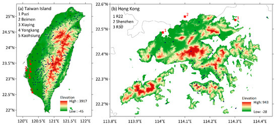 Elevation map of (a) Taiwan Island and (b) Hong Kong, and locations of the raingauge stations. Red squares indicate selected base stations for development of orographic intensification factor (OIF).