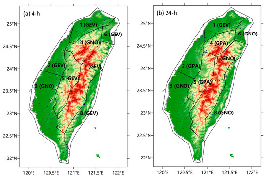 Sketch of (a) 4-h and (b) 24-h homogeneous regions of Taiwan and the best-fit distributions for homogeneous regions.