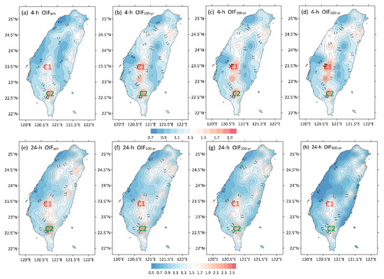 Spatial distribution maps of Taiwan (a–d) 4-h and (e–h) 24-h OIFs under southwesterly moisture inflow: (a,e) based on annual maximum rainfalls (OIFam); (a,f) based on 100-year rainfall quantiles (OIF100-yr); (b,g) based on 200-year rainfall quantiles (OIF200-yr); (c,h) based on 500-year rainfall quantiles (OIF500-yr). C1 and C2 indicate the high value centers of OIFs at Ali and Weiliao Mountain, respectively.