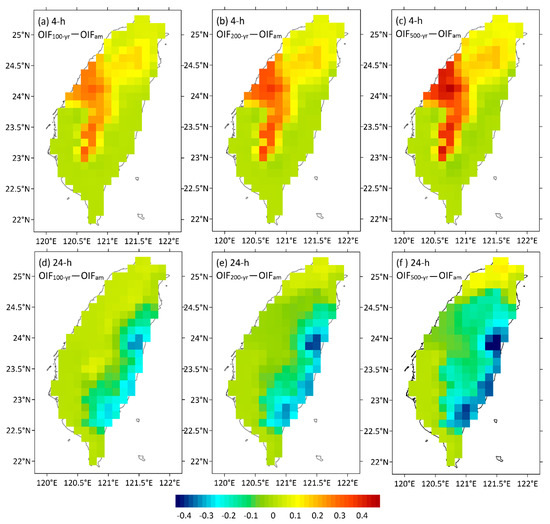 Differences of (a–c) 4-h and (d–f) 24-h OIFs based on annual maximum rainfalls, 100-, 200-, and 500-year rainfall quantiles: (a,d) OIF100-yr—OIFam; (b,e) OIF200-yr—OIFam; (c,f) OIF500-yr—OIFam.