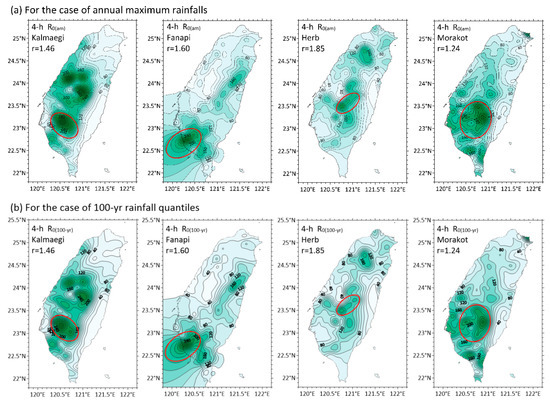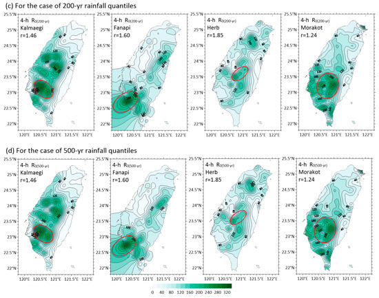 Four-hour convergence rainfall isohyetal maps of storms of TCs Kalmaegi, Fanapi, Herb, and Morakot affecting Taiwan for the cases of (a) annual maximum rainfalls, (b) 100-year rainfall quantiles, (c) 200-year rainfall quantiles, and (d) 500-year rainfall quantiles. Red circles and r denote the generalized ellipses for the convergence rainfalls and their aspect ratios, respectively.