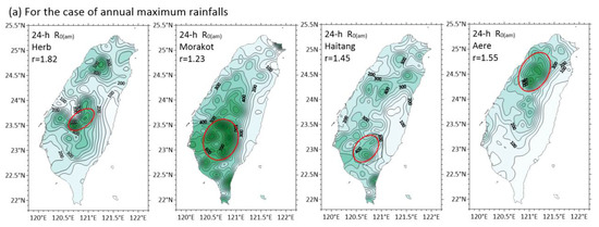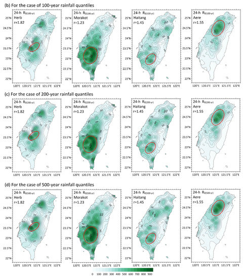 Twenty-four-hour convergence rainfall isohyetal maps of storms of TCs Herb, Morakot, Haitang, and Aere affecting Taiwan for the cases of (a) annual maximum rainfalls, (b) 100-year rainfall quantiles, (c) 200-year rainfall quantiles, and (d) 500-year rainfall quantiles. Red circles and r denote the generalized ellipses for the convergence rainfalls and their aspect ratios, respectively.