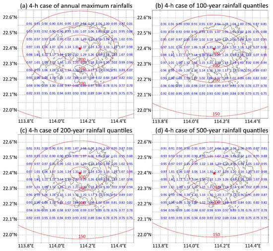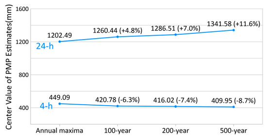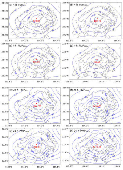As can be observed from Figure 9, 4-h PMPs estimated based on rainfall quantiles are smaller than PMPam, and along with the increasing return periods, the center values (denoted by red numbers in Figure 9) vary slightly down by about 6%–9% (see Figure 10) for 4-h. While for 24-h, it shows an upper trend and the increasing percentage of PMP500-yr is up to 11.6%. The decreasing (increasing) variation tendency of center values of 4-h (24-h) PMP is resulting from the increasing (decreasing) trend of 4-h (24-h) OIFs in the center of the convergence rain. The point PMP estimates were compared with the extreme rainfall records in Hong Kong and the world records [28,34,35] to examine their rationality. The point 4-h (24-h) PMPs exceeds the maximum 4-h (24-h) rainfall of 384.0 mm (956.0 mm) recorded at Lantau (Tai Mo Mountain) in Hong Kong but is smaller than the world record. Besides, they are smaller compared to the PMPs estimated by a revised Km-value method in Hong Kong (i.e., 558.5 mm for 4-h and 1,753.0 mm for 24-h) [49,50]. However, the PMP estimates obtained here so far are actually just embryonic PMPs, so more comparisons should be made after conducting some necessary adjustments such as moisture maximization.